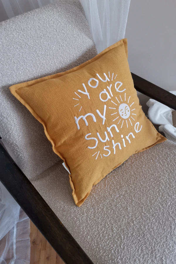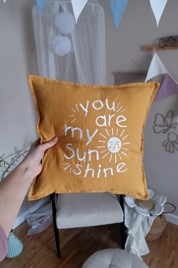 Dekoracyjna lniana poduszka z napisem „you are my sunshine”. Dla poszukiwaczy alternatywy w pochmurne dni.