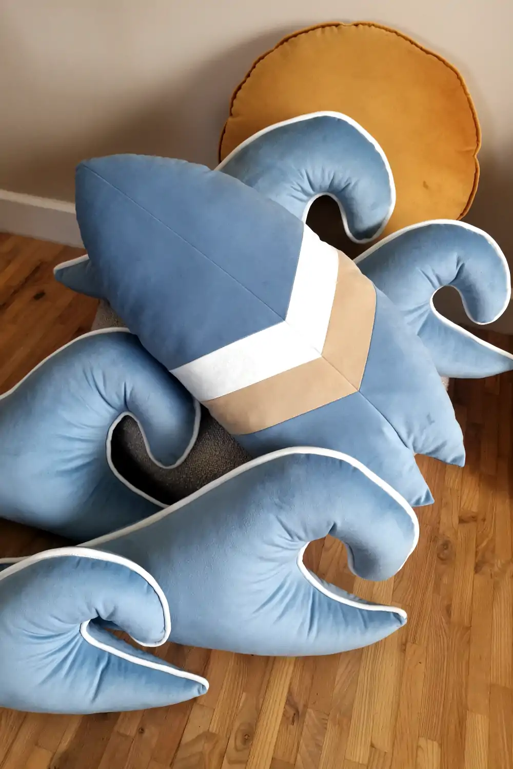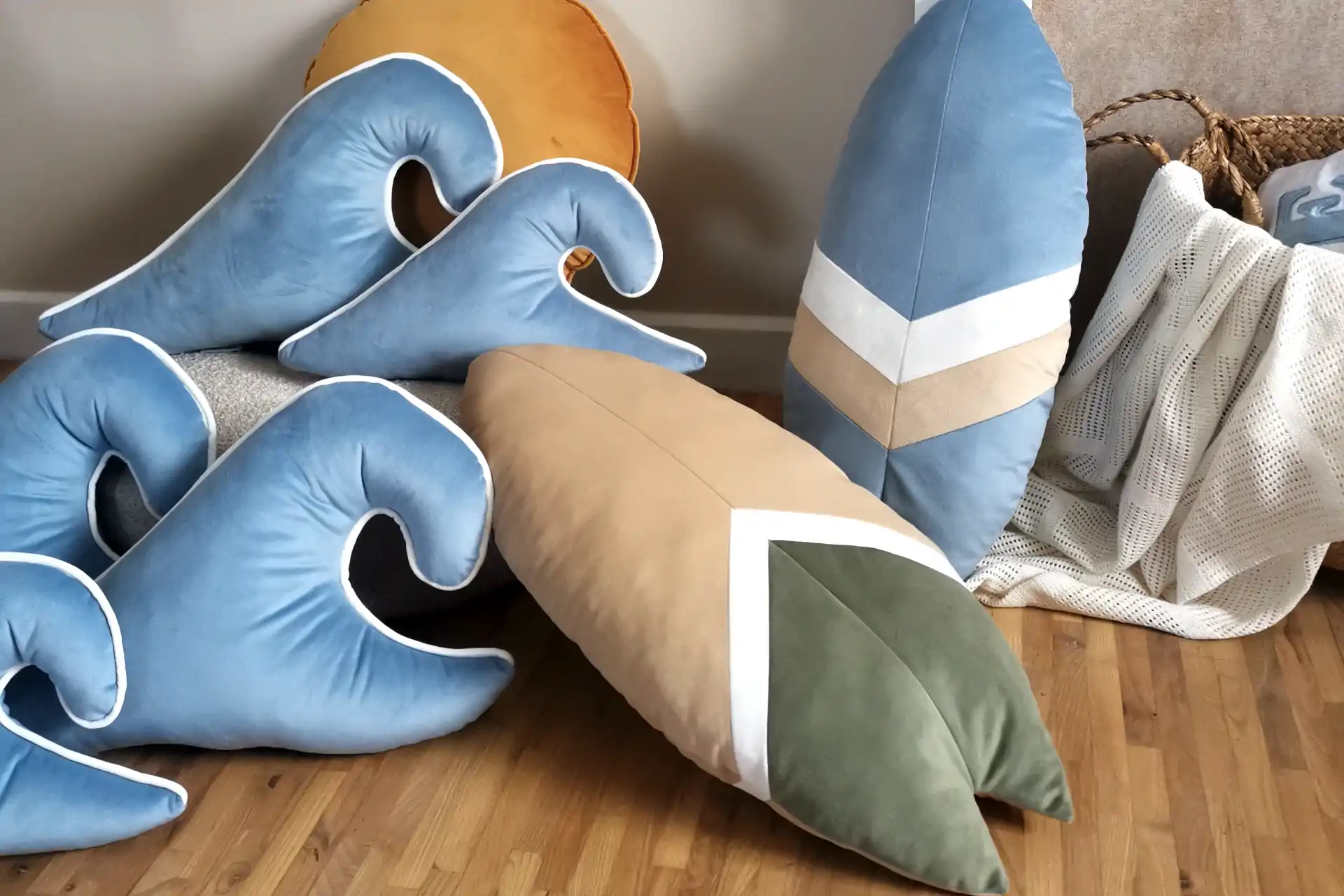 Ta niezwykła poduszka należy do mojej najnowszej kolekcji surferskiej na lato, która powstała z tęsknoty za słońcem, relaksem na plaży, szumem fal i całkowitym wakacyjnym odprężeniem.