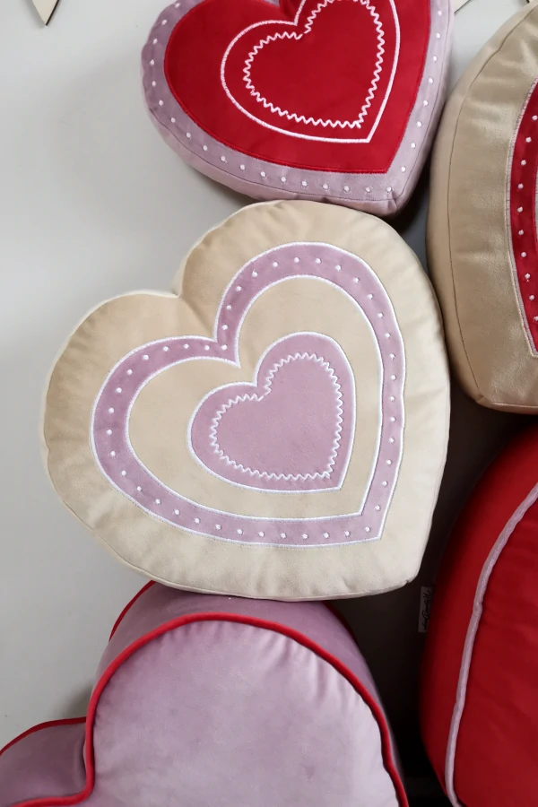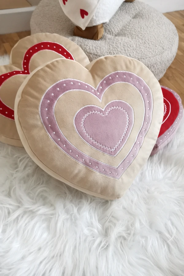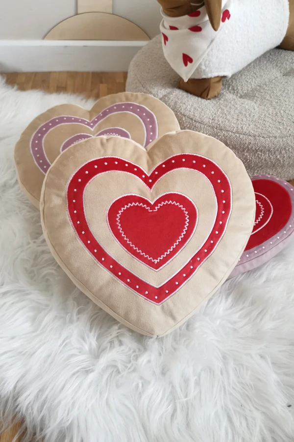 Poduszka w kształcie serca, z velvetu w kolorze beżowym z różową lub czerwoną aplikacją. Piękna ozdoba kanapy i fotela. Ciekawy prezent na Walentynki.