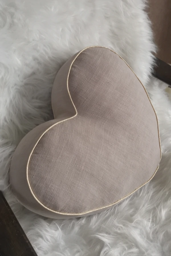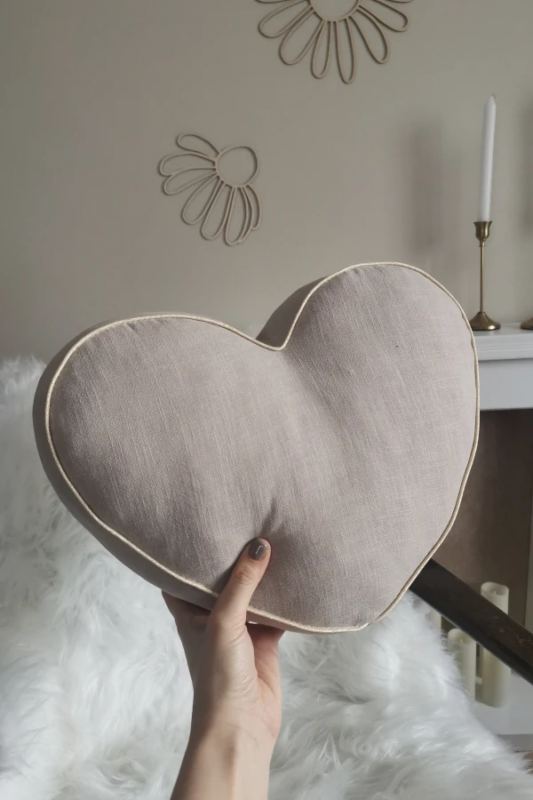 Dodaj odrobinę elegancji i naturalnego uroku do swojego wnętrza dzięki tej wyjątkowej poduszce w kształcie serca. Wykonana z wysokiej jakości lnu, który zapewnia przyjemną miękkość, a zarazem trwałość. Poduszka jest idealnym akcentem zarówno do salonu, jak i sypialni. Subtelna złota lamówka dookoła krawędzi nadaje jej wyjątkowego charakteru, wprowadzając do przestrzeni odrobinę luksusu.