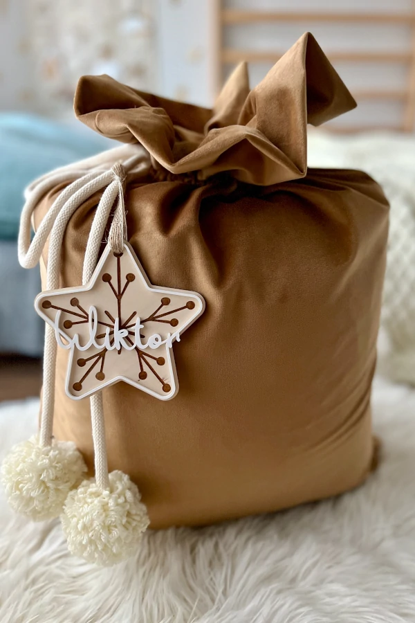Nasz świąteczny worek z brązowego velvetu to idealny dodatek do Twojego domu, który wprowadzi magię świąt i stworzy niezapomnianą atmosferę. Dzięki wysokiej jakości wykonania, eleganckiemu designowi i wszechstronnemu zastosowaniu, jest to dekoracja, która pozostanie z Tobą przez wiele lat. Jeśli wybiorą Państwo produkt z zawieszką i pragną Państwo, aby na zawieszce znalazła się personalizacja to proszę o wpisanie imienia w podsumowaniu zamówienia.